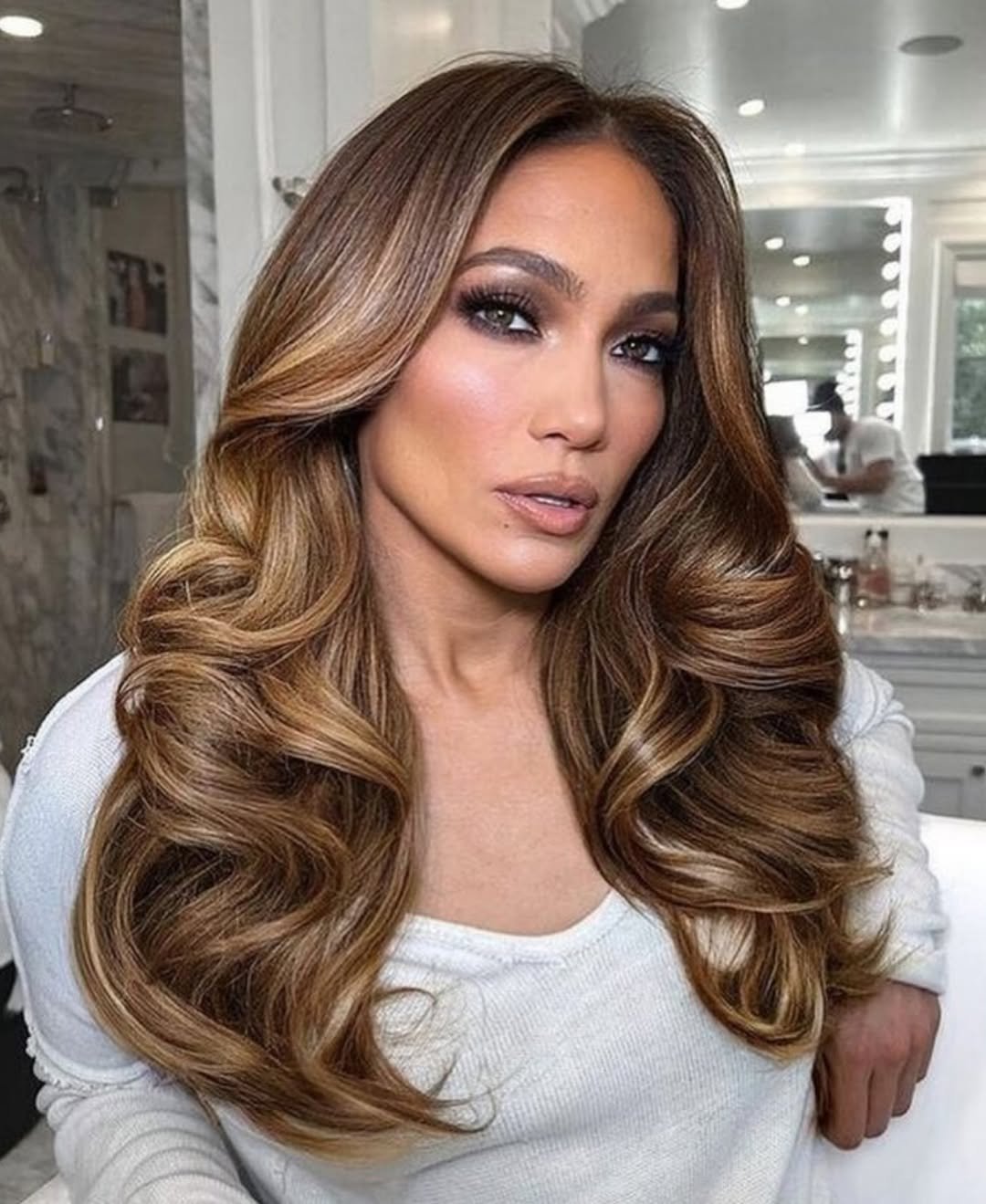 These waves are luxury on a cold day — big, glamorous, and full of that signature shine. They fall in perfect curves, reminding you of old-Hollywood hair but with a warm, caramel winter glow.