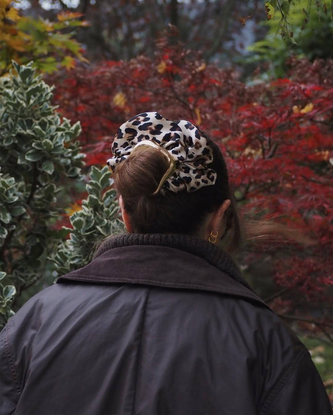A messy bun tucked under a bold scrunchie — it’s giving woodland-chic in the best way. The print feels warm and wintery, especially against the backdrop of colorful seasonal leaves.