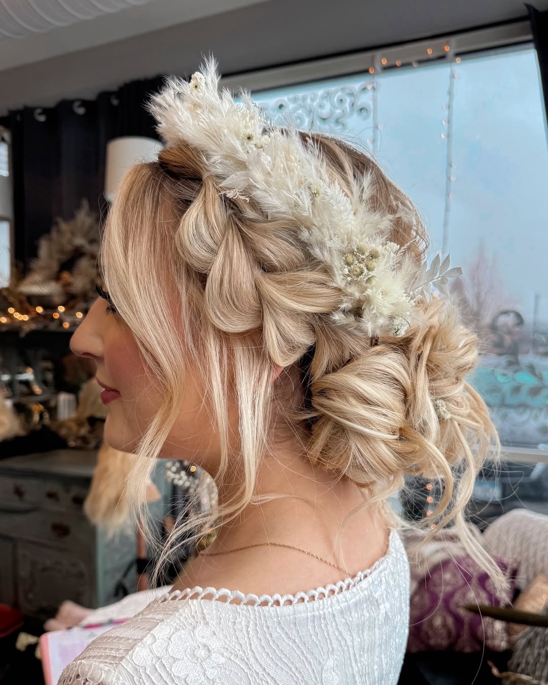 Soft, frosted, and beautifully romantic — this braided crown looks like it was made for winter weddings or snowy evenings out. The feathered florals tucked in add a dreamy, fairy-tale touch that feels both whimsical and elevated.