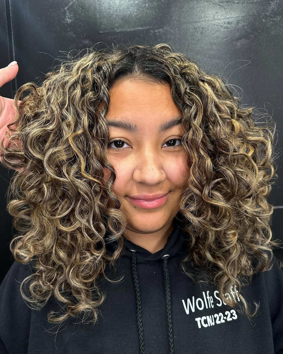 These curls have that perfect winter bounce — defined but not stiff, shiny but still touchable. The highlights thread through so naturally, giving the whole look a sunlit glow even on grey days.
