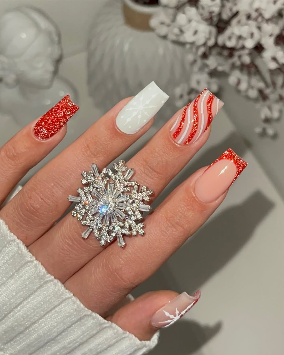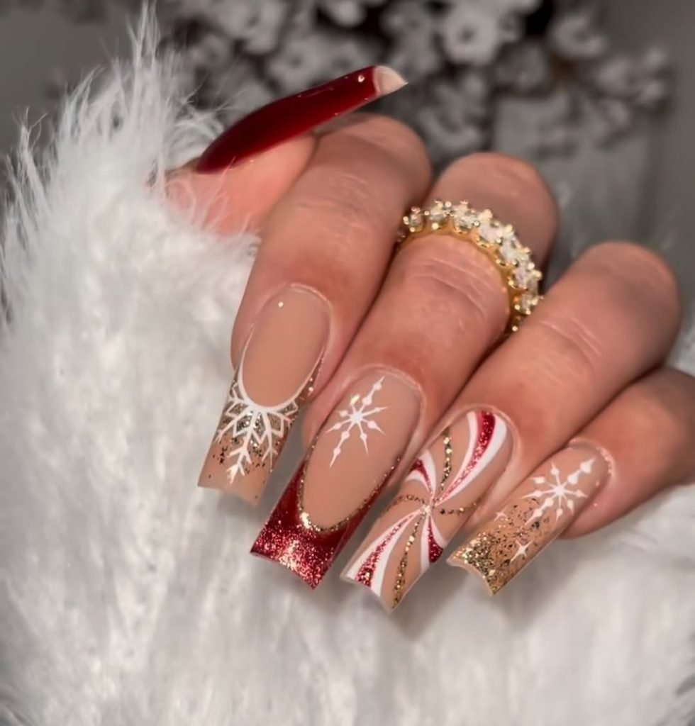 This one’s all about holiday glam — a mix of glitters, stripes, and snowflakes that instantly make you want to hum Christmas tunes. The red sparkle tips and candy cane accents bring festive cheer without feeling overdone.
