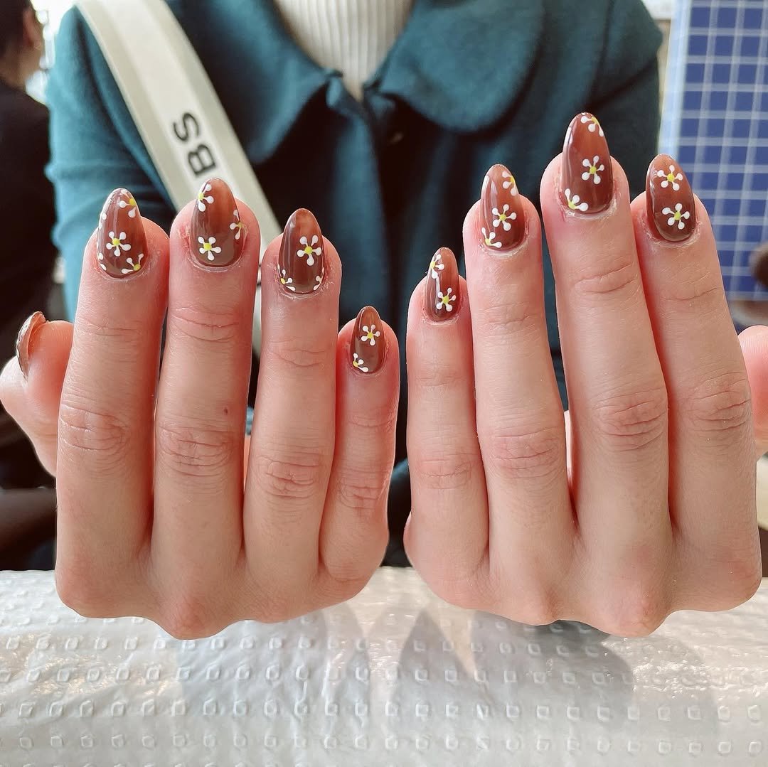 Rich mocha brown meets dainty florals in this effortlessly chic winter look. The glossy chocolate tones feel indulgent, while the tiny white daisies bring in a touch of sweetness and playfulness.