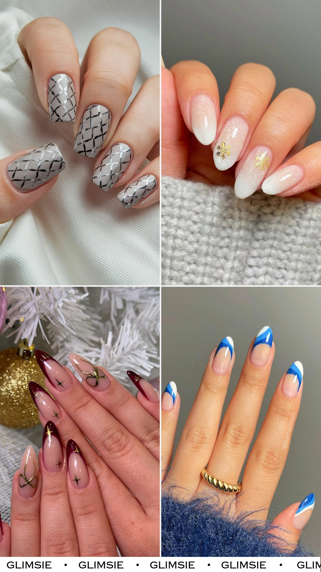This look says “holiday season, but make it couture.” The blend of candy-cane swirls, gold foil accents, and snowflake detailing gives classic red-and-white nails a seriously elevated twist.