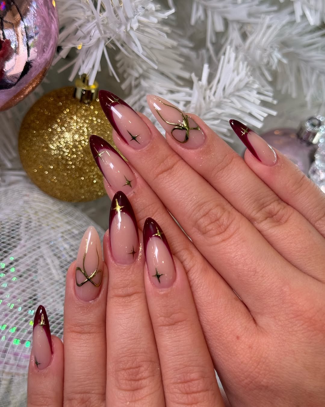 These red and nude almond nails are giving “holiday glam but make it couture.” The deep ruby chrome pairs with intricate snowflake detailing that looks like it was painted by an artist who secretly moonlights as a jeweler. It’s bold but still elegant—like a glass of merlot at a candlelit dinner.