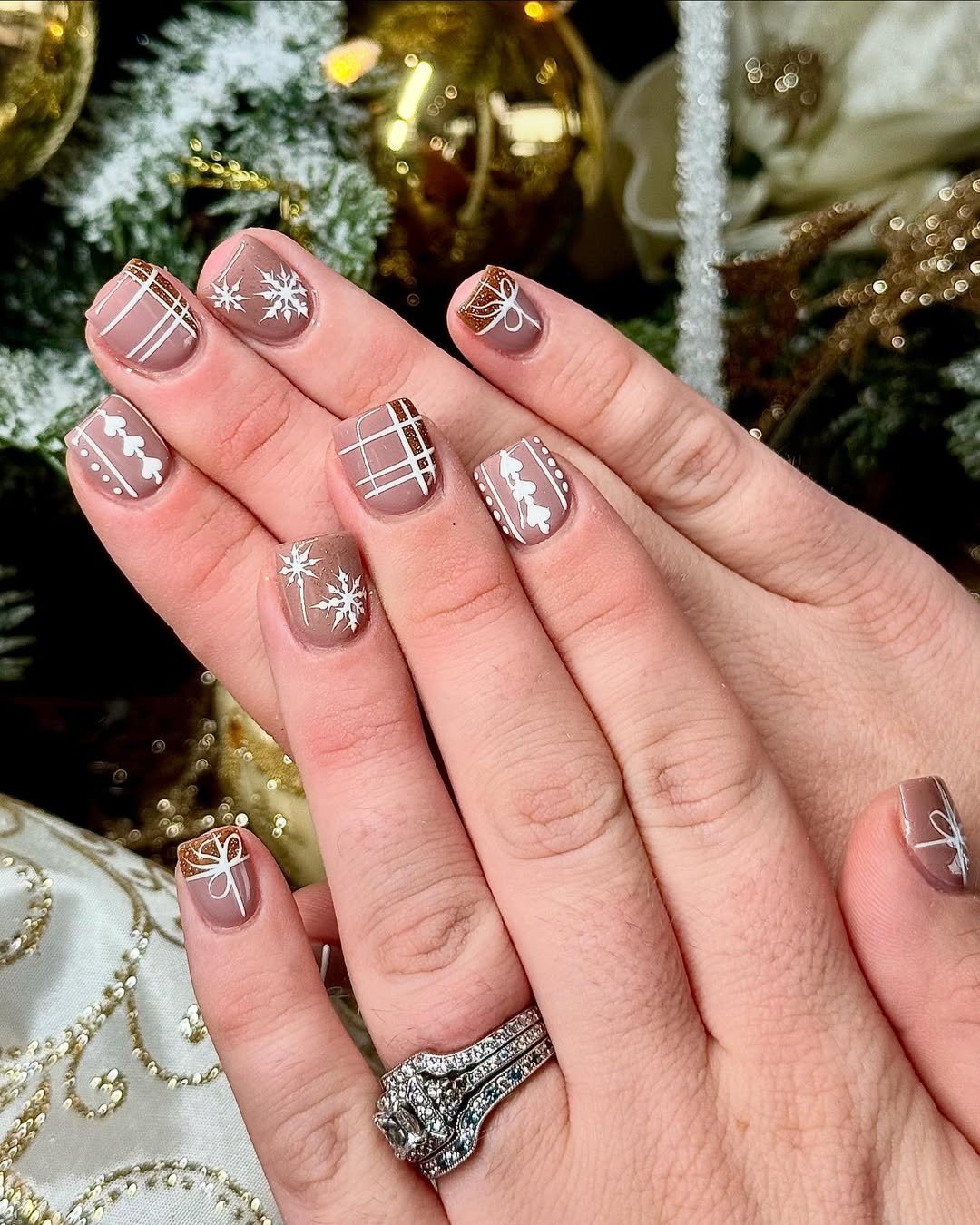 Soft, nude tones meet metallic precision in this elegant holiday set. The white snowflakes and gift-wrap lines are perfectly balanced against subtle gold accents — festive but still refined. It’s like wrapping paper for your fingertips, only far more wearable.