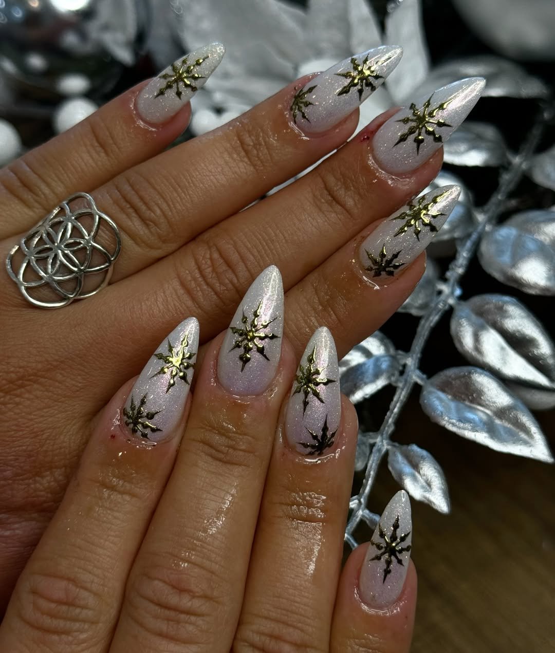 These nails shimmer like champagne at midnight — icy, gold-flecked perfection with a celestial twist. The gold starbursts feel luxe and magical, catching the light in a way that’s impossible to ignore.