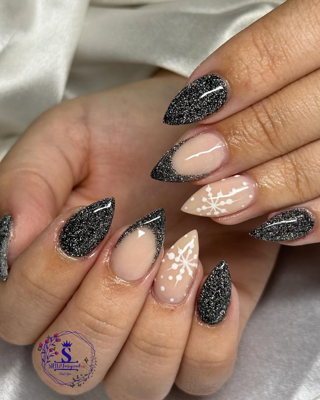 Black glitter tips that fade into a soft nude base—this set is pure drama with just enough restraint. It’s winter glamour in its most wearable form. The snowflake details in white make the contrast pop, like stars against a velvet sky.