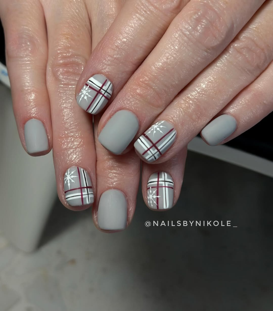 This matte gray and burgundy combo feels like a cozy flannel come to life. The plaid design is crisp and graphic, balanced perfectly with dainty white snowflakes that soften the overall look.