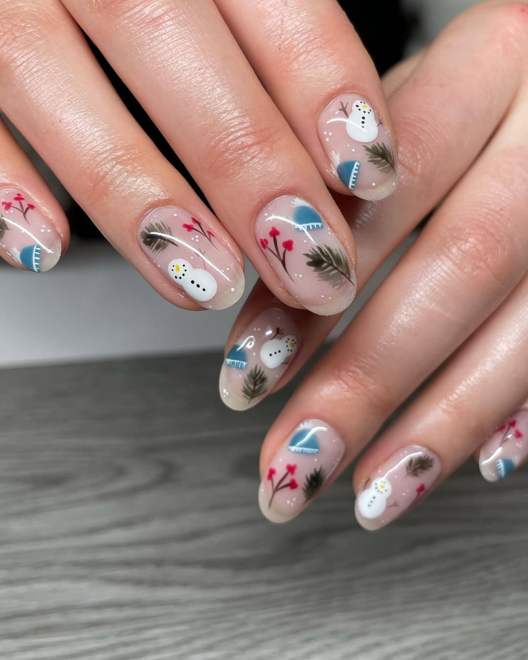 Whimsical, nostalgic, and impossibly cute—these nails look like the first page of a winter storybook. Tiny snowmen, red berries, and soft greenery scatter across a sheer nude base, creating a design that’s both playful and delicate.