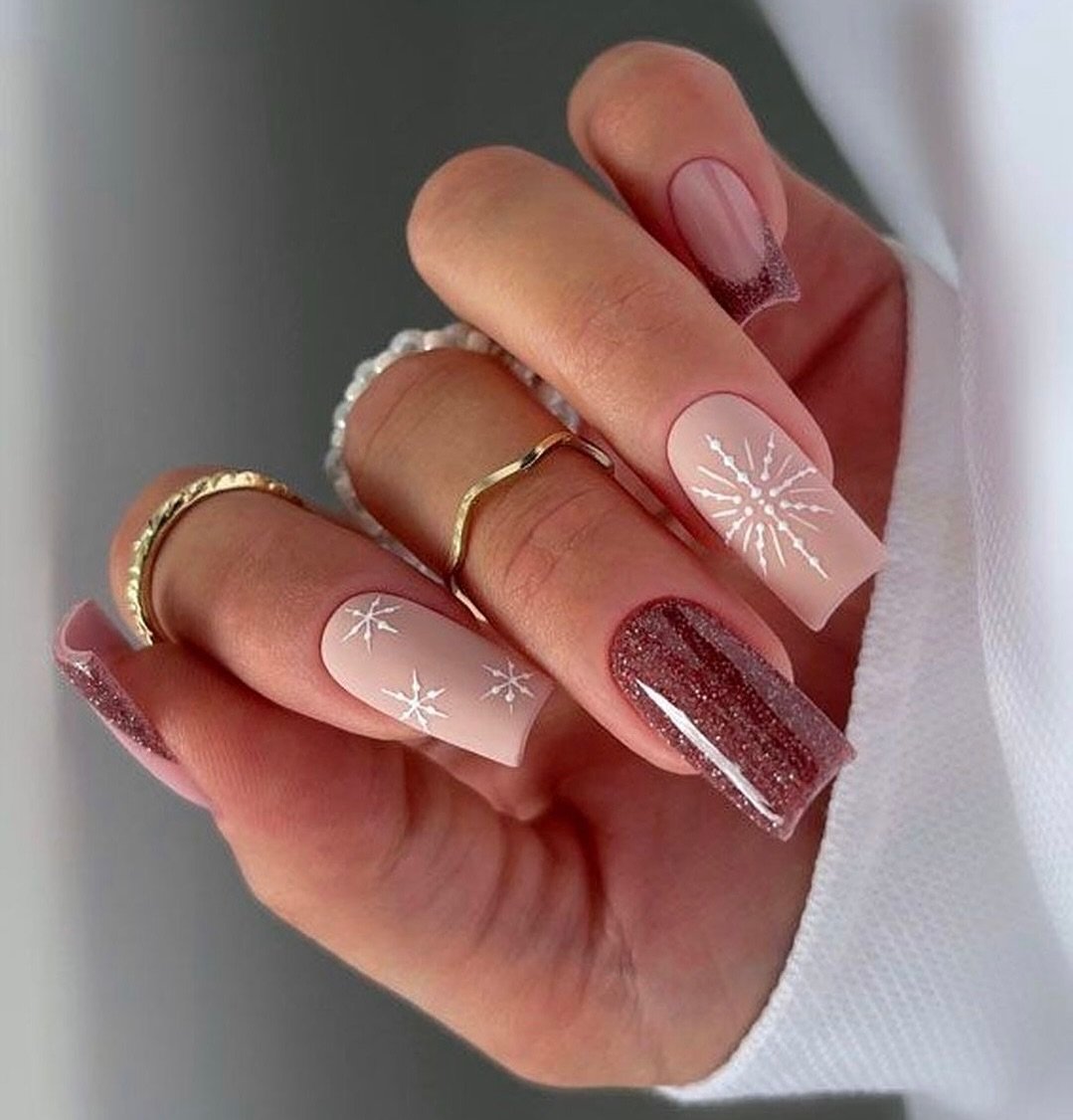Soft pink meets subtle shimmer in this dreamy winter look. The glittery plum accents add warmth to the cool-toned base, while the snowflake designs keep everything seasonal and sweet.