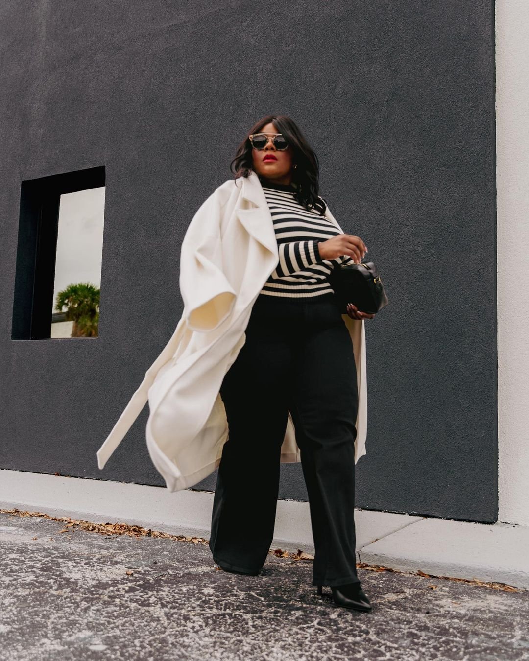 There’s such power in a clean winter contrast, and this look absolutely nails it. The black-and-white striped knit feels timeless and Parisian, especially under that cascading cream wrap coat that moves with so much drama. Paired with sleek black trousers and pointed boots, it becomes this ultra-polished winter uniform.