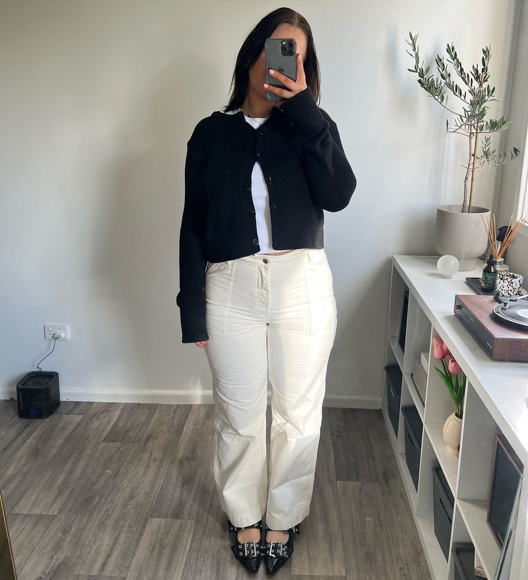 A cropped black cardigan with crisp cream pants? Winter perfection. The palette is striking but still warm and wearable — like a modern take on monochrome. The wide-leg trousers bring that relaxed, effortless feel, while the pointed studded flats add a chic, unexpected bite.