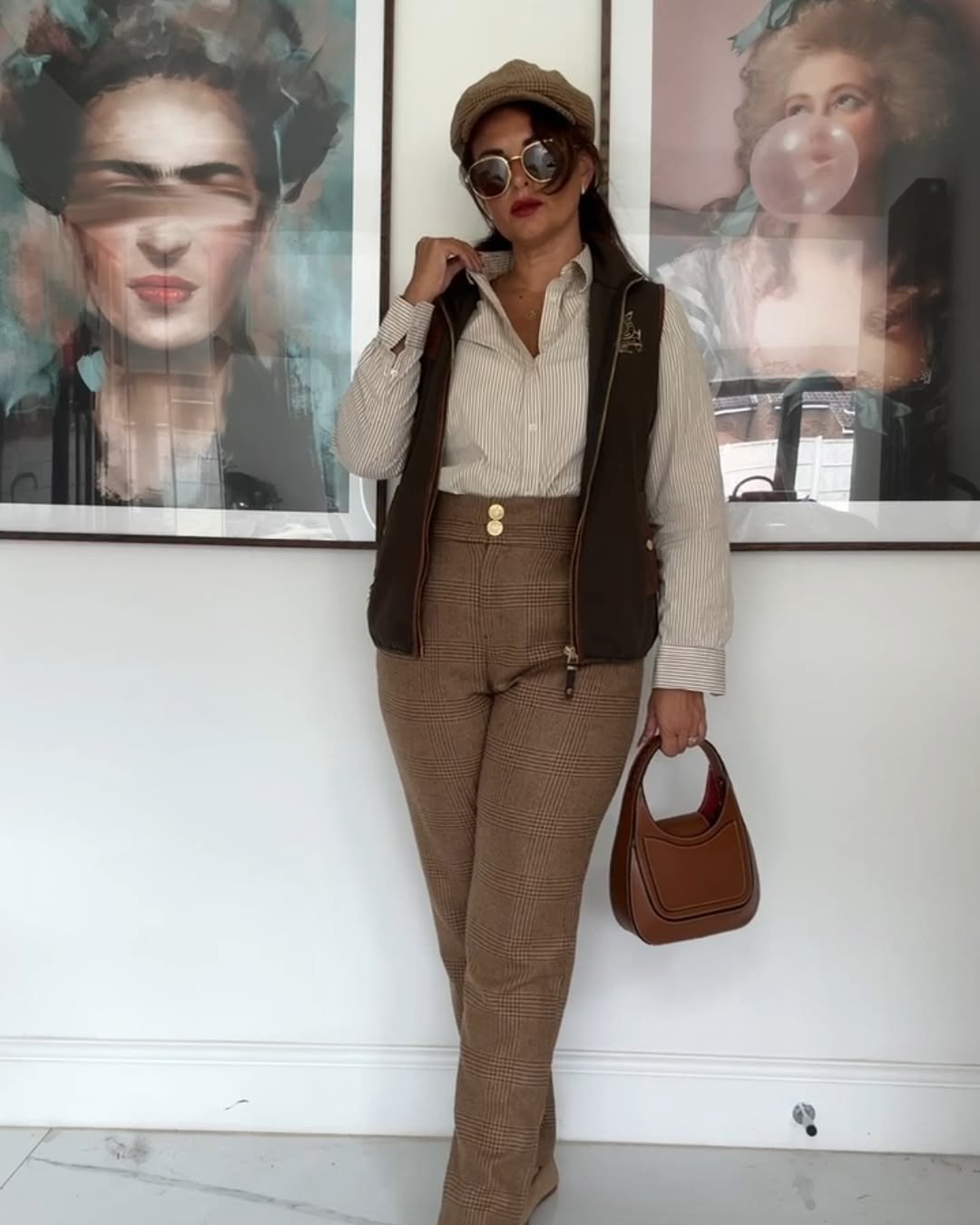 This outfit has that British countryside charm — earthy browns, tailored lines, and small, thoughtful accessories. The plaid trousers and striped shirt offer a subtle pattern mix that feels refined, while the vest adds structure and a bit of equestrian flair. And the hat? The perfect finishing touch that ties the entire look together.