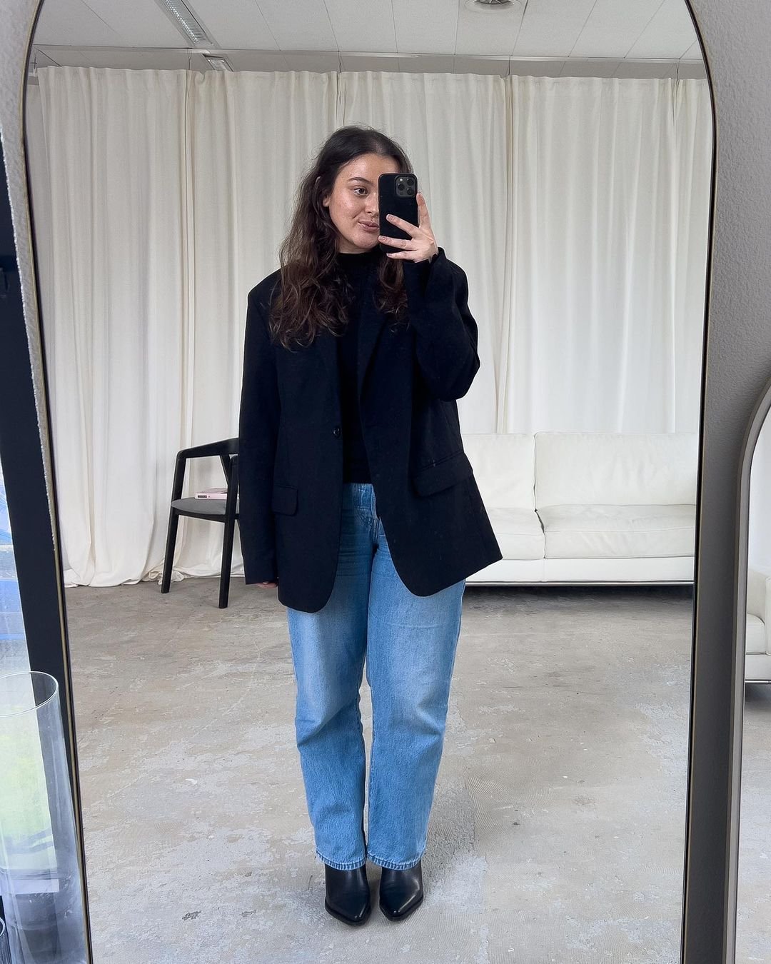 There’s something quietly powerful about an all-black top half paired with lived-in blue denim. The oversized blazer softens into the space so naturally, like it was made for winter days spent moving between cozy cafés and crisp sidewalks. And the pointed black boots? They add just the right dose of polish without making the look feel too “done.”