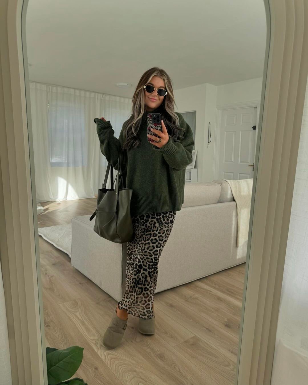There’s something so effortlessly comforting about this look — like stepping into a slow winter morning where everything feels soft and unhurried. The deep forest-green knit paired with the fluid leopard skirt creates this delicious mix of cozy and playful.