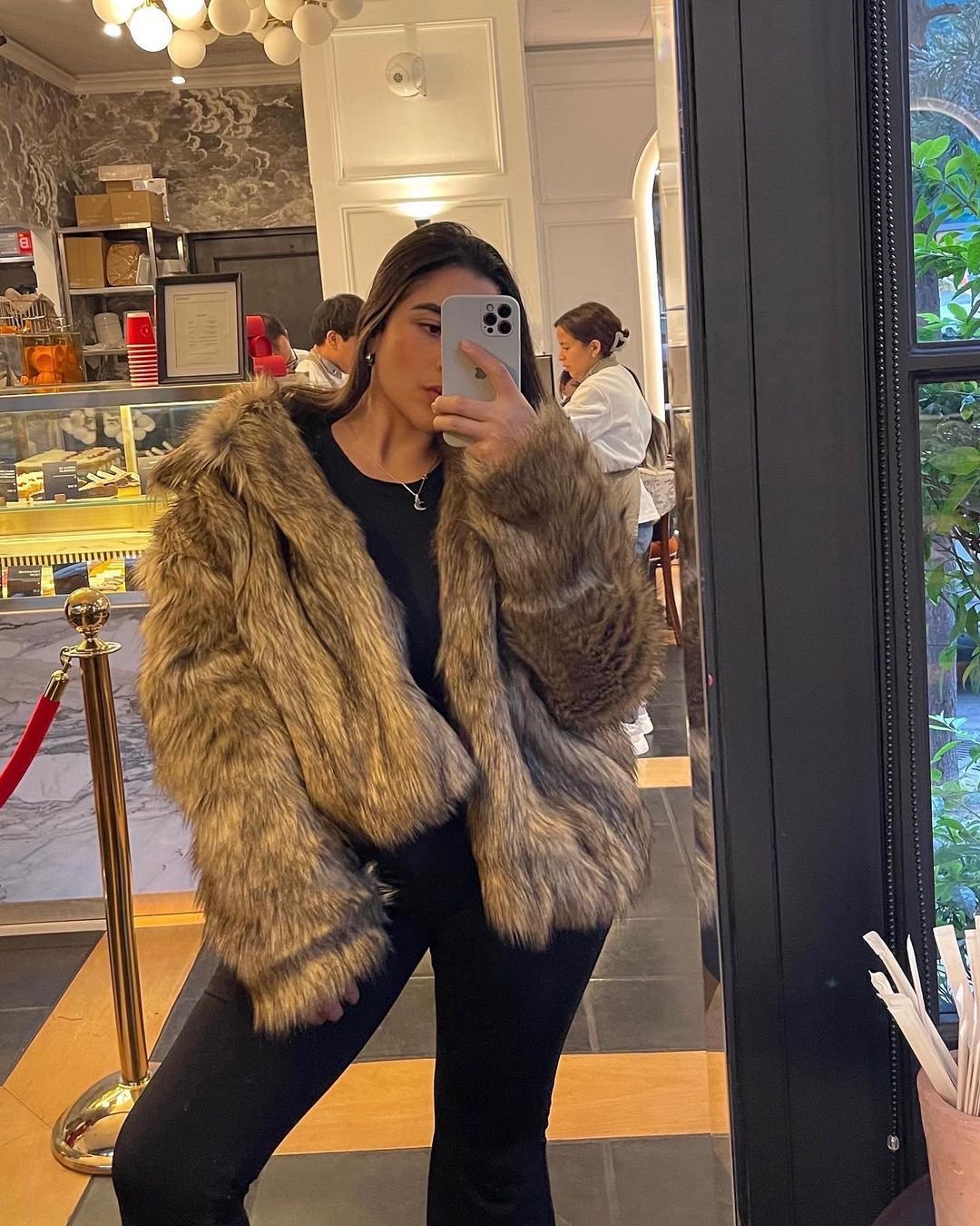 Nothing says winter glamour quite like a plush faux-fur coat, and this one steals the whole show. The rich, warm texture plays beautifully against the sleek all-black base, making the outfit feel both effortless and high-impact at the same time. The subtle jewelry and soft waves add a touch of elegance without competing with the coat’s statement energy.