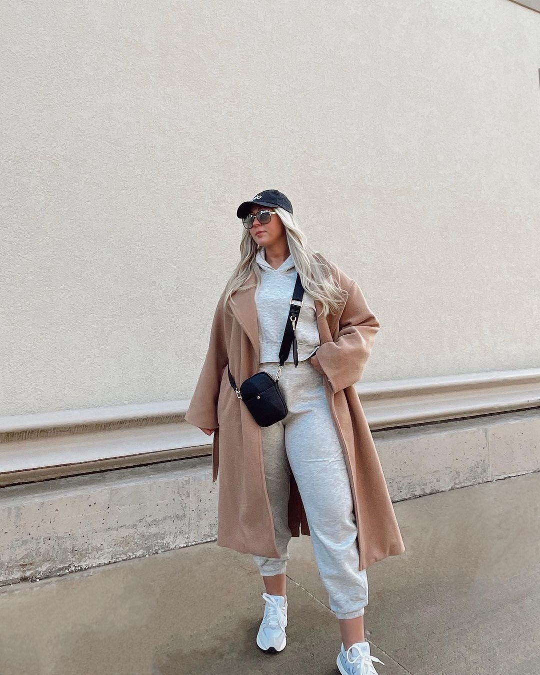 There’s something so refreshing about a winter look that doesn’t try too hard yet still feels incredibly pulled together. The soft grey sweatsuit paired with a camel coat gives off that “Sunday stroll but make it chic” energy. The baseball cap and crossbody add a sporty twist, while the white sneakers keep everything light and modern.