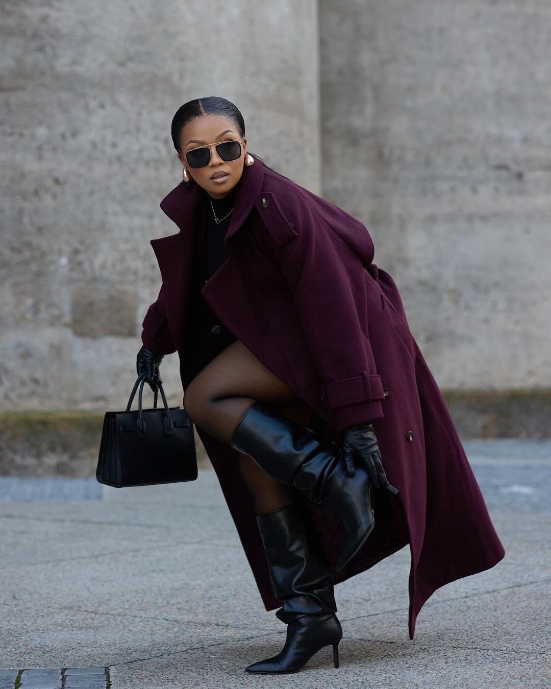 This look radiates winter luxury. The deep burgundy coat paired with tall black leather boots is such a powerful combo — sleek, rich, and undeniably chic. The structured handbag and gloves elevate the whole aesthetic even further, giving it that refined, cold-weather glamour typically reserved for magazine spreads.