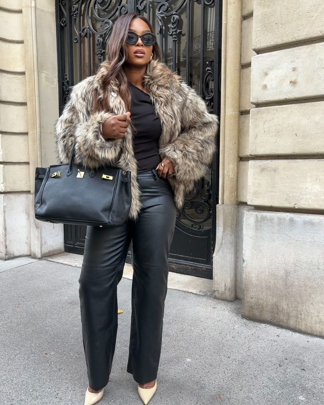 Soft faux-fur paired with leather trousers is one of those winter combinations that instantly feels luxe. The warm, natural tones of the jacket bring texture and richness, while the sleek black pants keep everything streamlined.