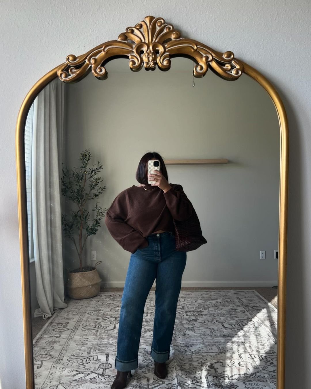 Rich chocolate tones give this look a sophisticated depth that feels perfect for winter. The slightly oversized sweater drapes beautifully, especially against the deep-blue denim with its crisp rolled hem.