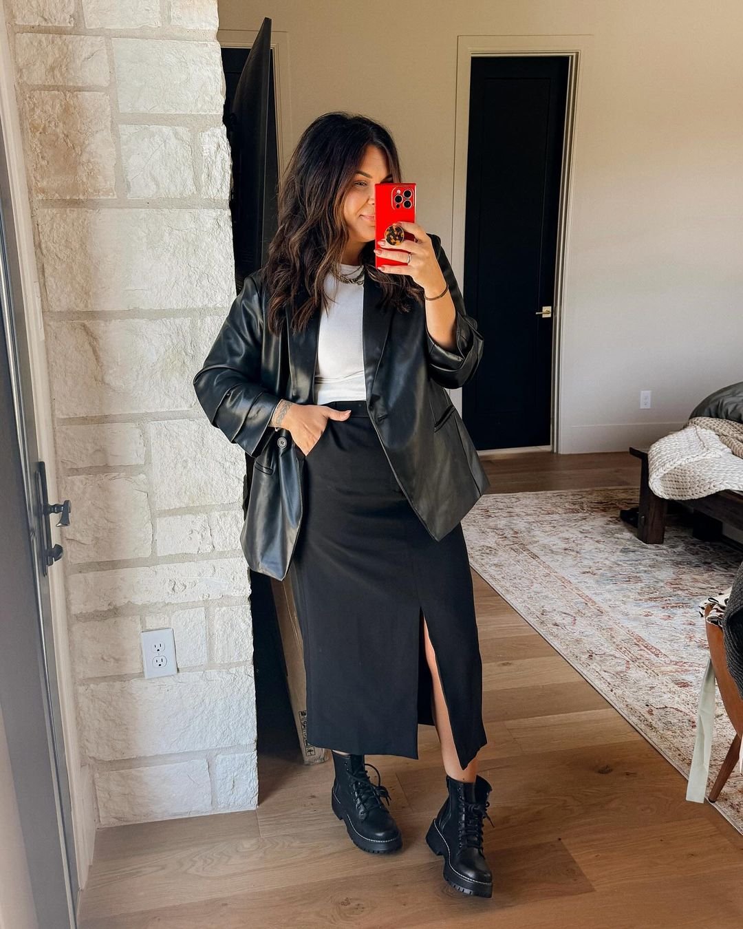 Black-on-black never disappoints, especially when it’s done with thoughtful structure. The faux-leather blazer adds this glossy, modern edge, while the long skirt and subtle side slit soften the silhouette beautifully.
