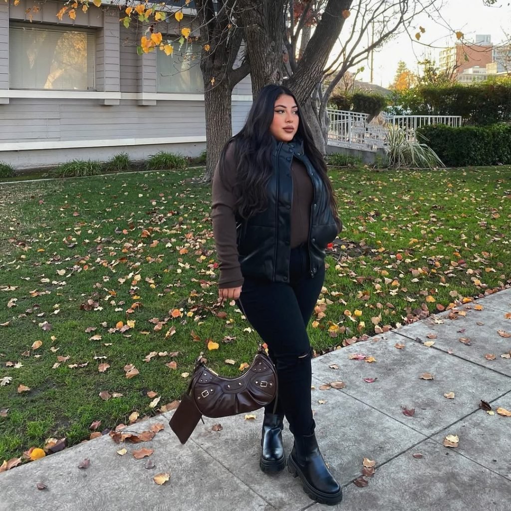 Brown and black together always hit differently in the colder months — rich, grounded, and a little moody. The brown knit paired with a sleek black vest makes the whole outfit feel structured yet soft, especially against the leafy winter backdrop. The black jeans and chunky boots keep it rooted in street-style ease.