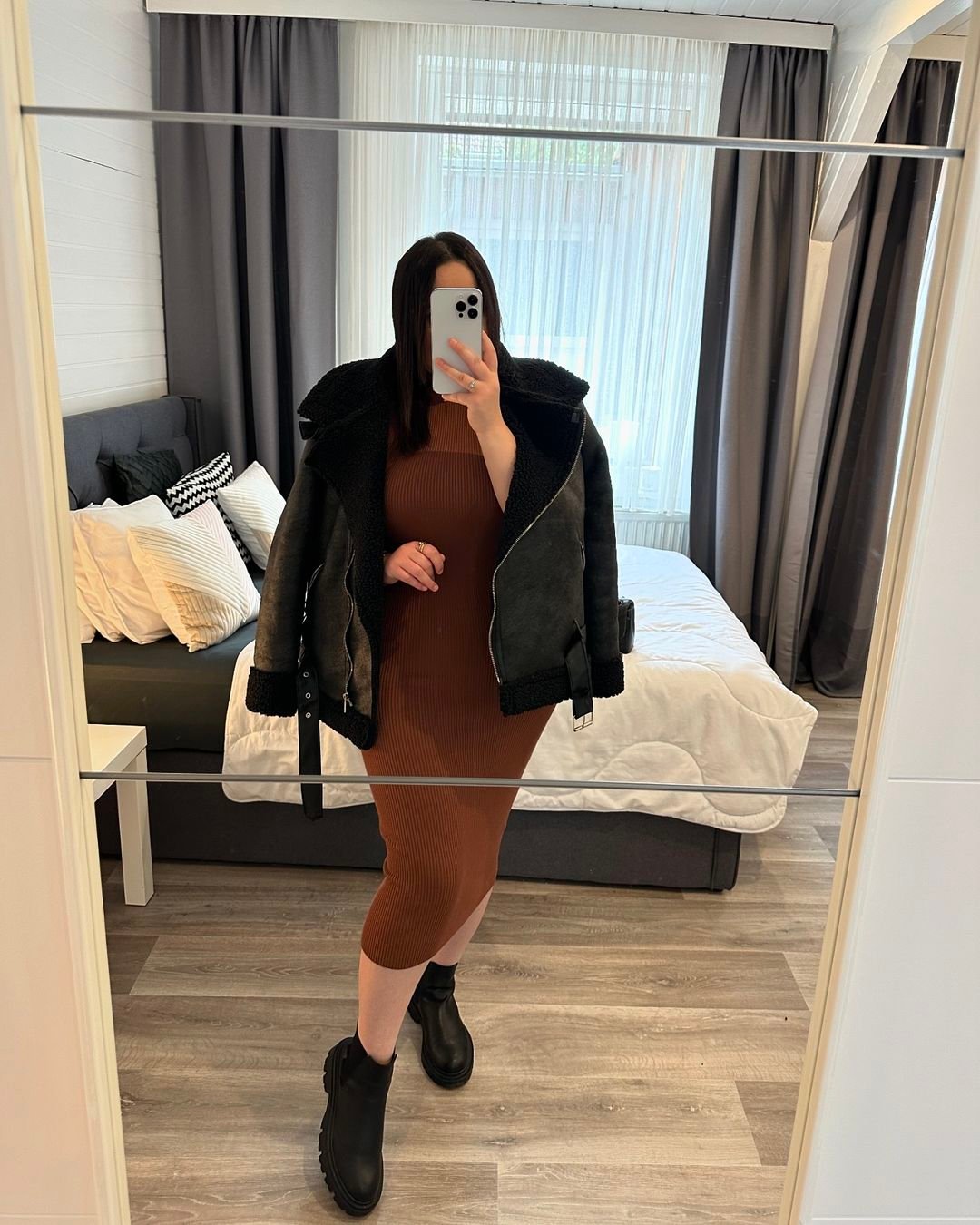 This outfit is giving luxe minimalism with a dash of cool-girl edge. The fitted brown ribbed dress feels warm yet elevated, and topping it with a plush shearling-lined jacket instantly makes it winter-strong.