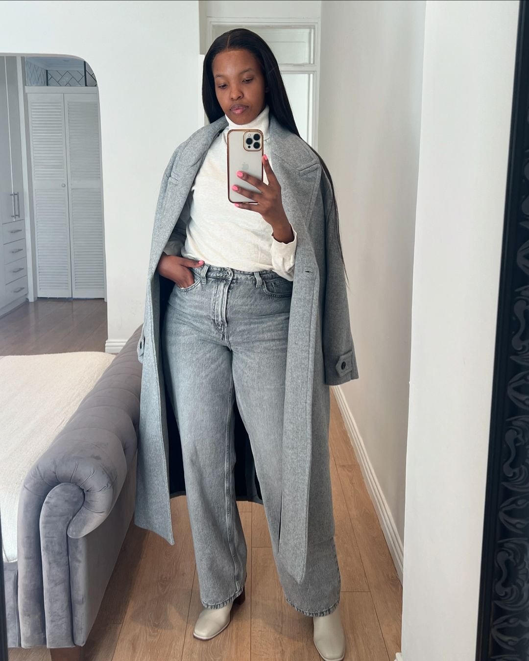 This grey-on-grey palette is winter serenity at its finest. The tailored coat worn open over soft denim feels airy yet structured — a combination that always reads elevated. The creamy boots add a whisper of warmth and keep the look intentionally soft.