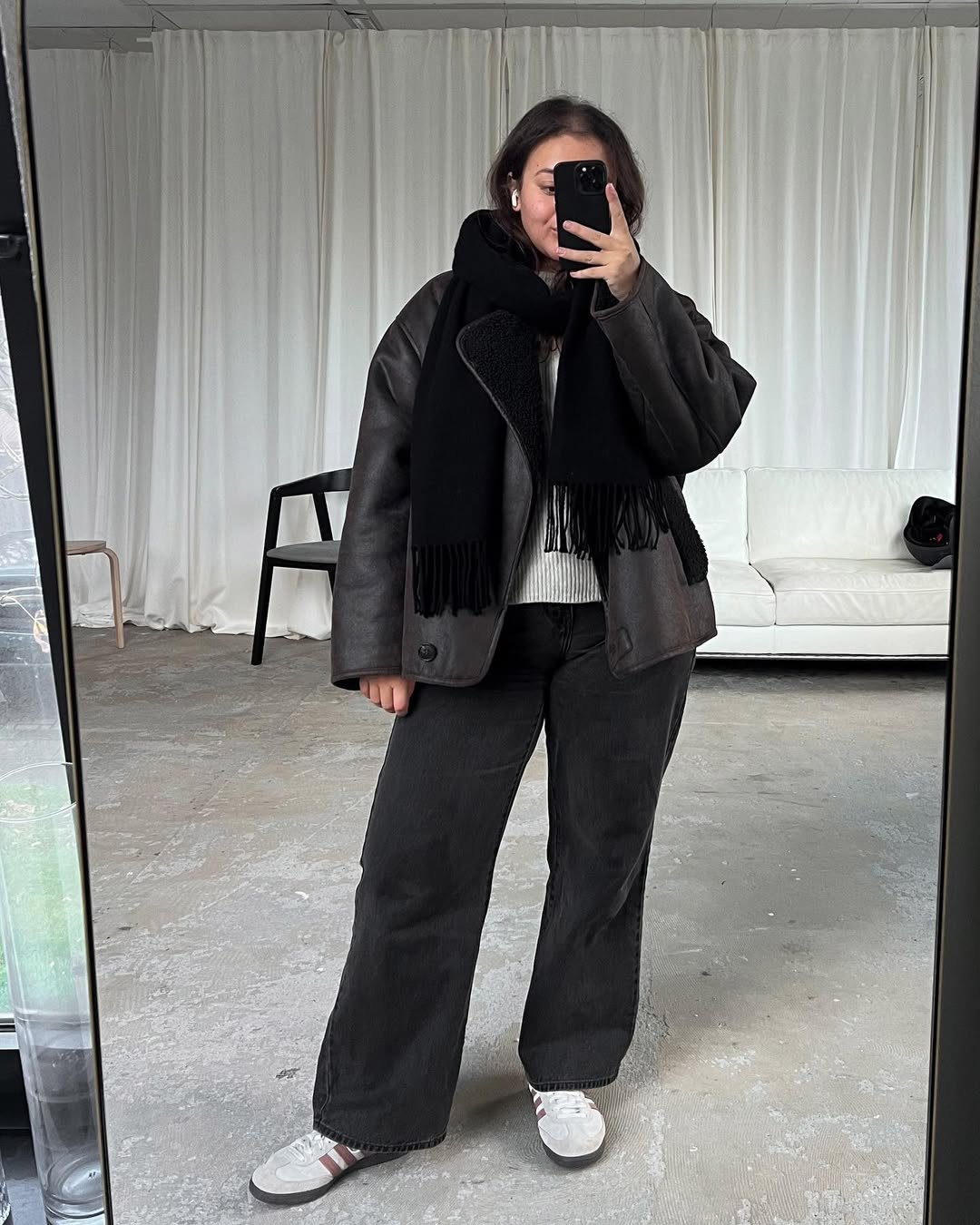 This look leans into that bundled-up, winter-morning energy in the best way. The charcoal shearling jacket layered over a soft knit and wide-leg denim creates this relaxed, slightly oversized silhouette that feels warm and quietly chic. And I love how the scarf pools around the neckline, adding depth and comfort.