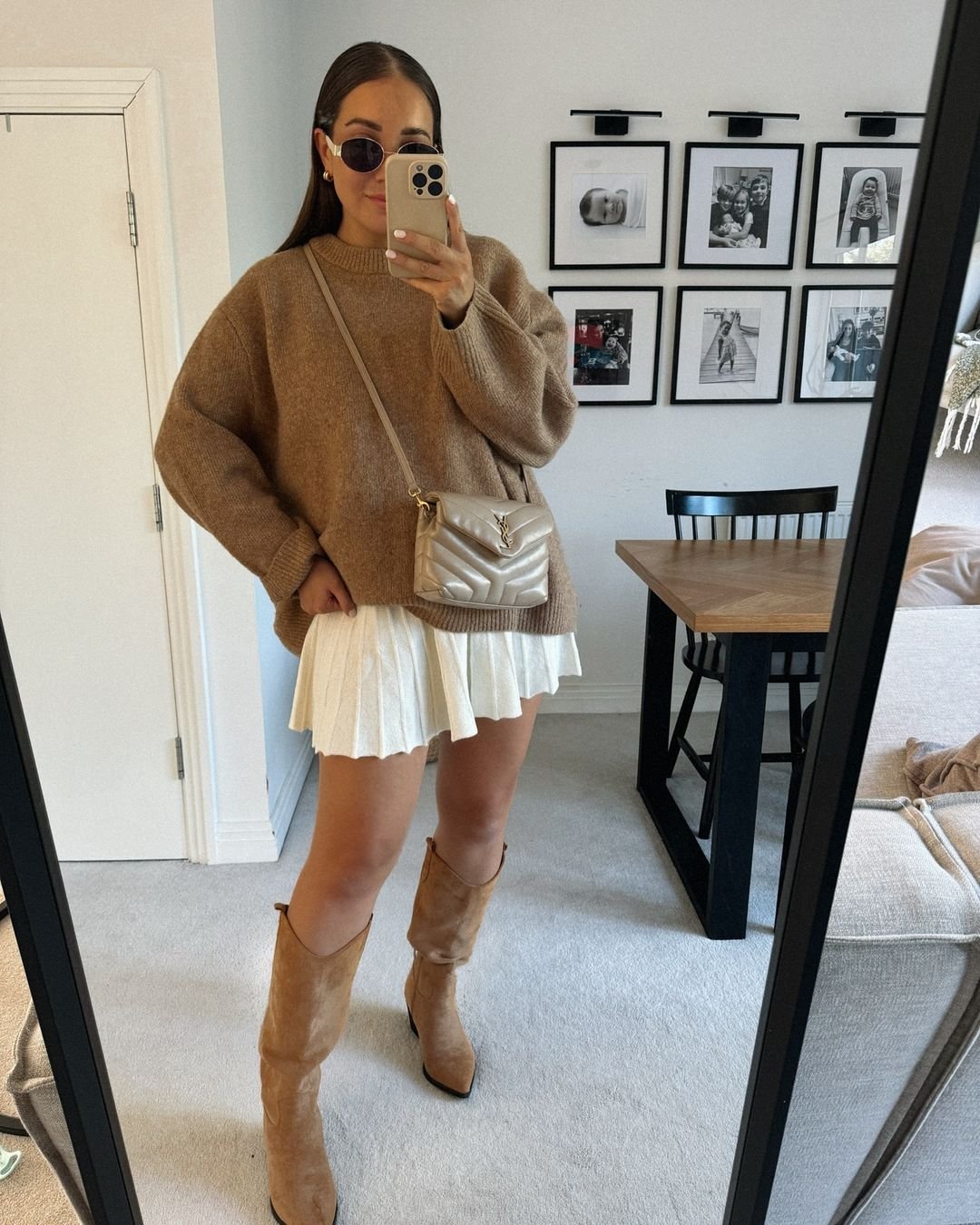 There’s something so sweet about pairing a chunky tan sweater with a flirty pleated mini — it brings out that playful side of winter dressing. The suede boots echo the warm tones, creating a deliciously cozy monochrome feel. And the quilted crossbody bag adds just a touch of luxury without overpowering the softness.