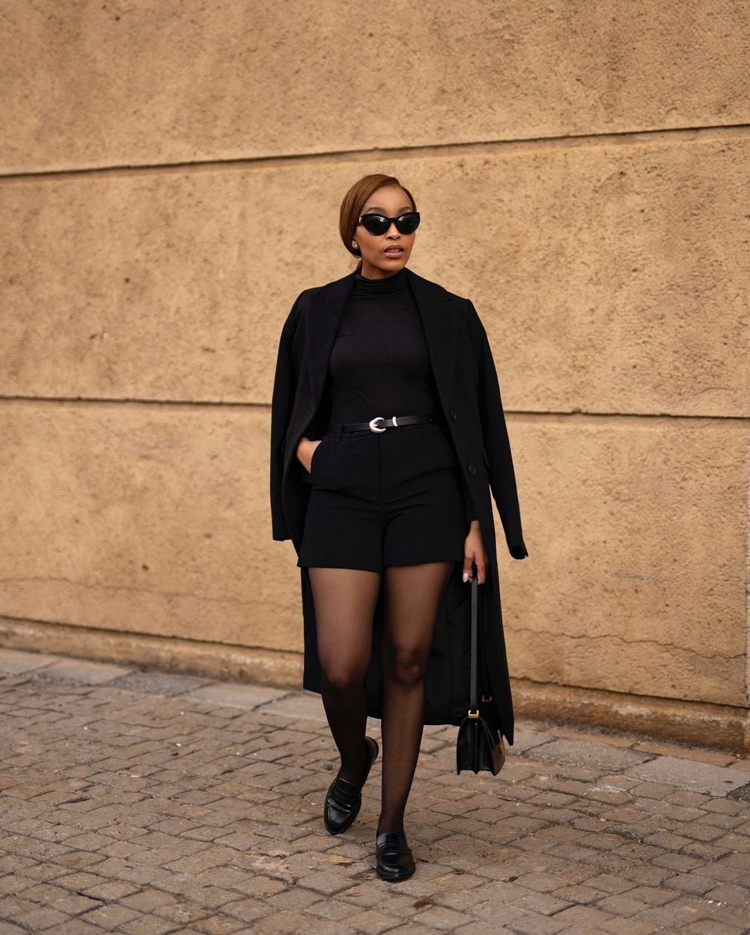 There’s a timeless confidence woven into this all-black ensemble. The tailored shorts with sheer tights create such a sleek winter silhouette, especially paired with the long structured coat. It’s elegant without being fussy.