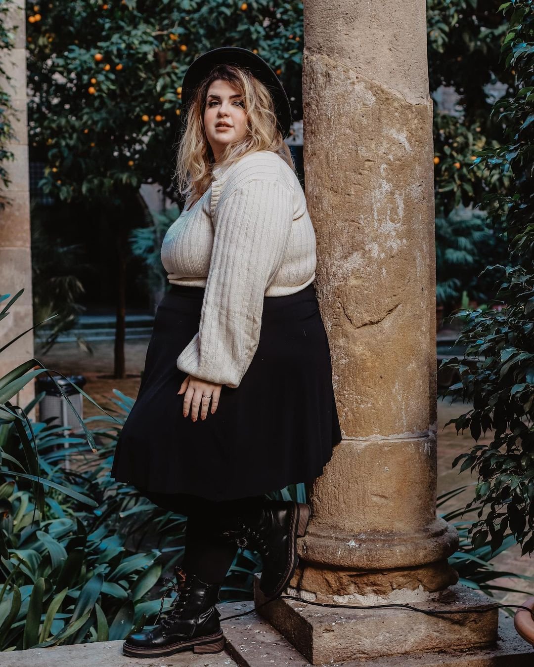 This outfit feels like stepping into a storybook courtyard — the ribbed cream sweater and flowing black skirt bring a dreamy softness, while the combat boots add the perfect grounding edge. The wide-brim hat introduces just a hint of wanderer glamour, like she’s exploring a winter garden on a slow afternoon.