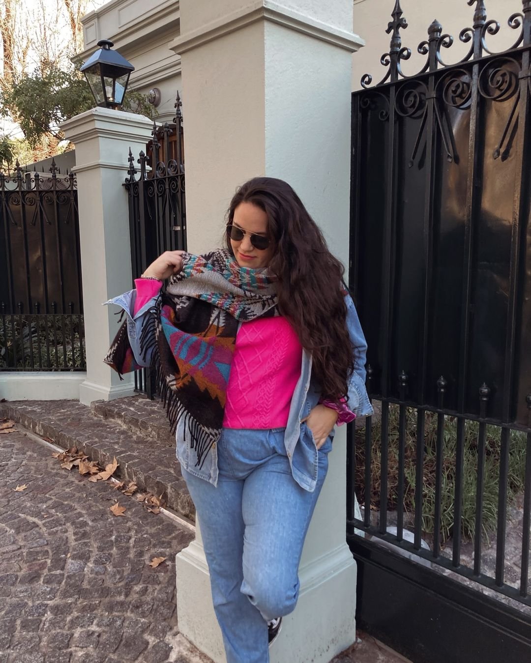 I adore how joyful this look feels. The bright pink knit brings instant warmth, like a little burst of sunshine against colder days. Layering it with light-wash denim on denim keeps it casual, while the oversized patterned scarf adds such cozy texture and personality.