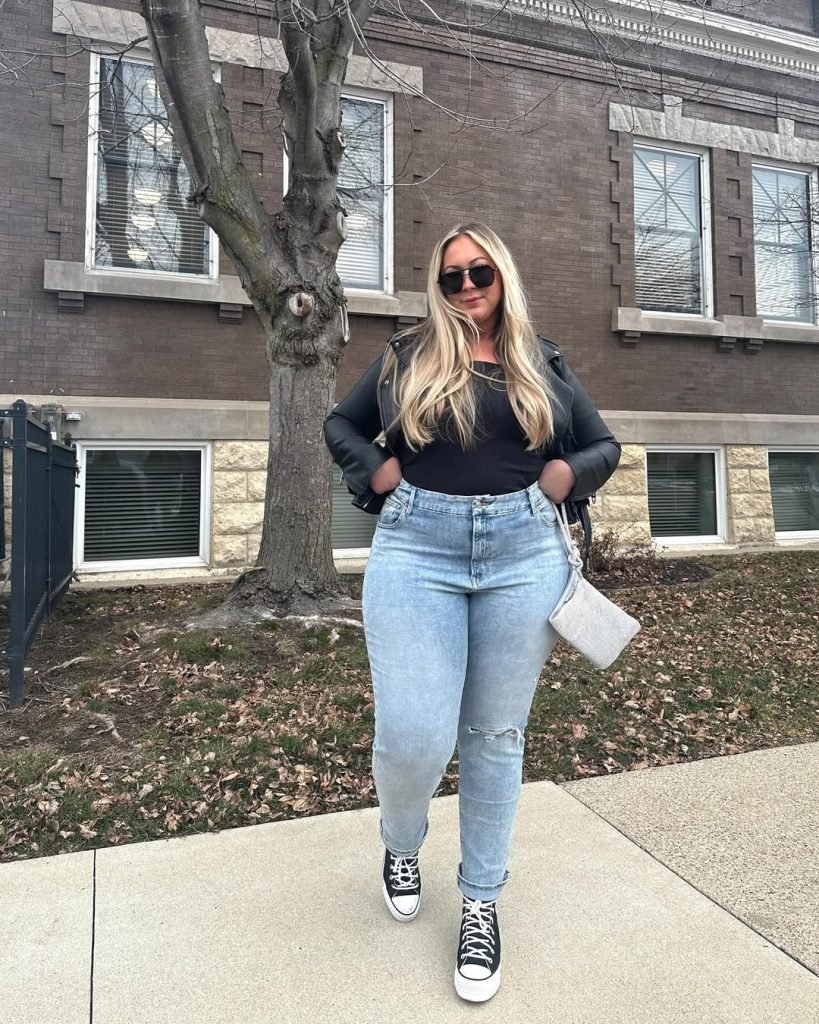 This look leans into winter casual in the most stylish way. The light-wash jeans feel perfectly lived-in, while the black top and leather jacket ground the entire outfit with a sleek edge. I love the mix of classic elements — Converse sneakers, a simple shoulder bag, easy hair — all coming together with that relaxed confidence.
