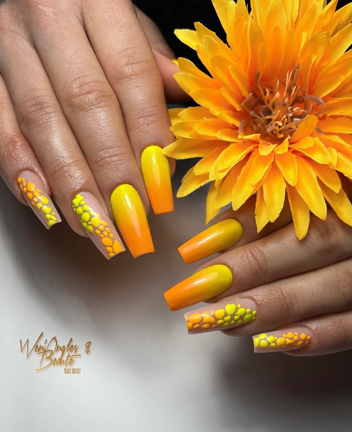 This manicure brings serious tropical energy. The vibrant gradient from sunny yellow to juicy orange creates a glowing sunset effect that instantly feels warm and bold.