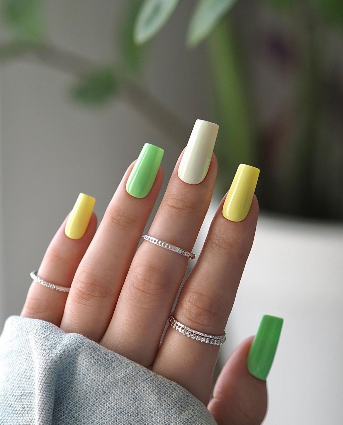 This manicure takes a fun twist with a bright color-block palette. The mix of lime green, pastel yellow, and creamy neutral tones creates a playful gradient that feels super modern.