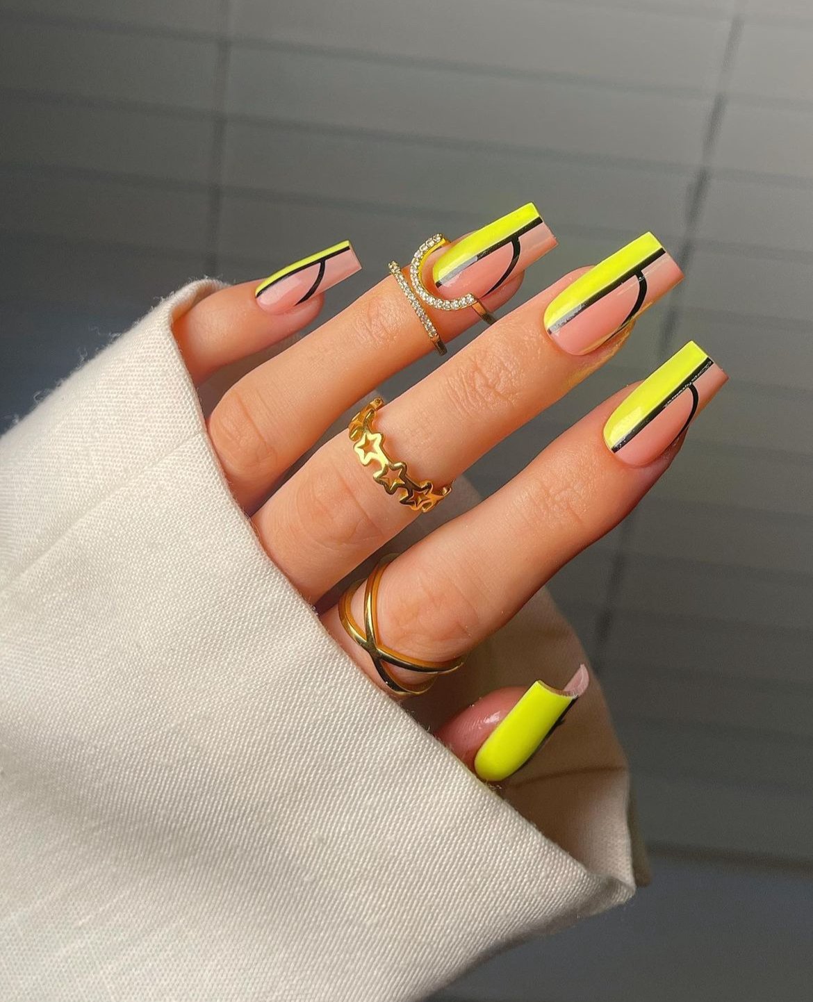 This manicure is all about that crisp, minimal vibe. The super thin neon yellow tips bring a subtle flash of color while keeping the overall look clean and sophisticated.