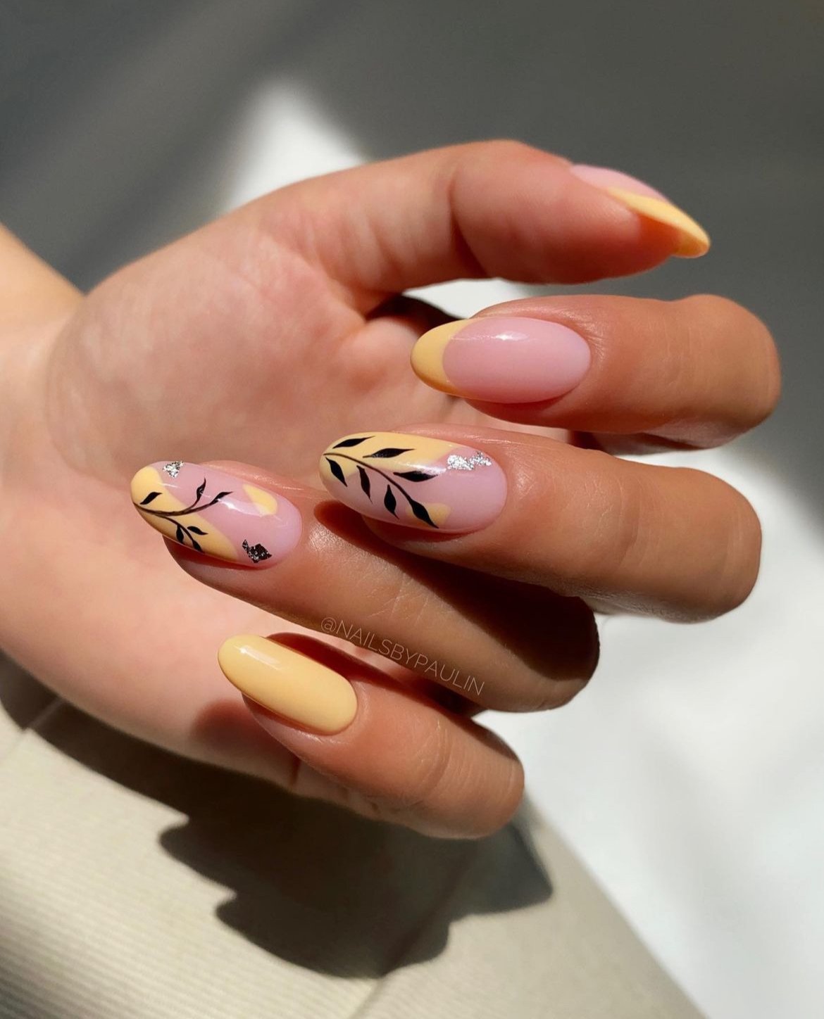 The contrast between the nude base, the mustard tones, and those leafy black lines makes the whole design feel stylish and a bit sophisticated. It’s modern nail art that still feels wearable every day.