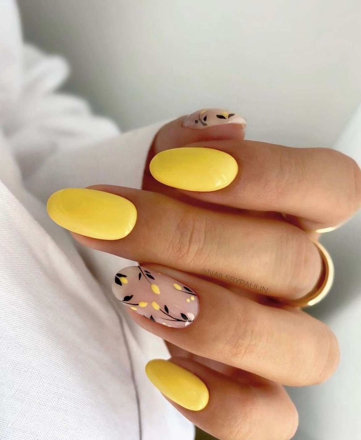 There’s something really elegant about this mustard-yellow manicure. The glossy solid nails bring bold color, while the accent nails with black botanical artwork add depth and a little artistic flair.