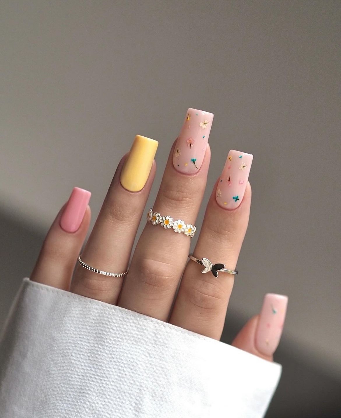 This manicure feels like a soft spring day wrapped up in pastel colors. The mix of baby pink and buttery yellow creates such a gentle palette, while those tiny scattered floral pieces add a playful, almost confetti-like charm.
